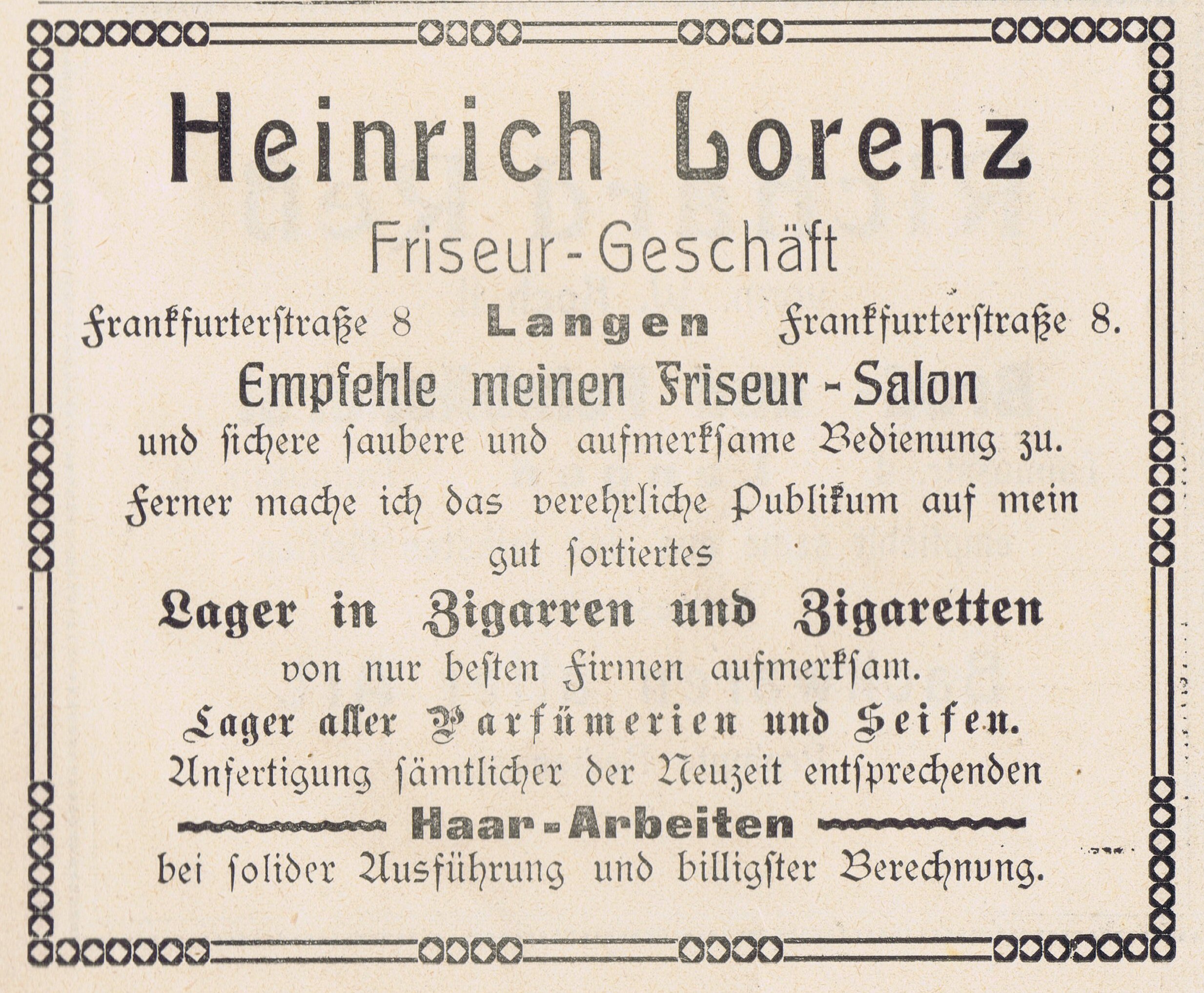 | Titel | 1912 Anzeige Frankfurter Straße 8 Friseur Lorenz |